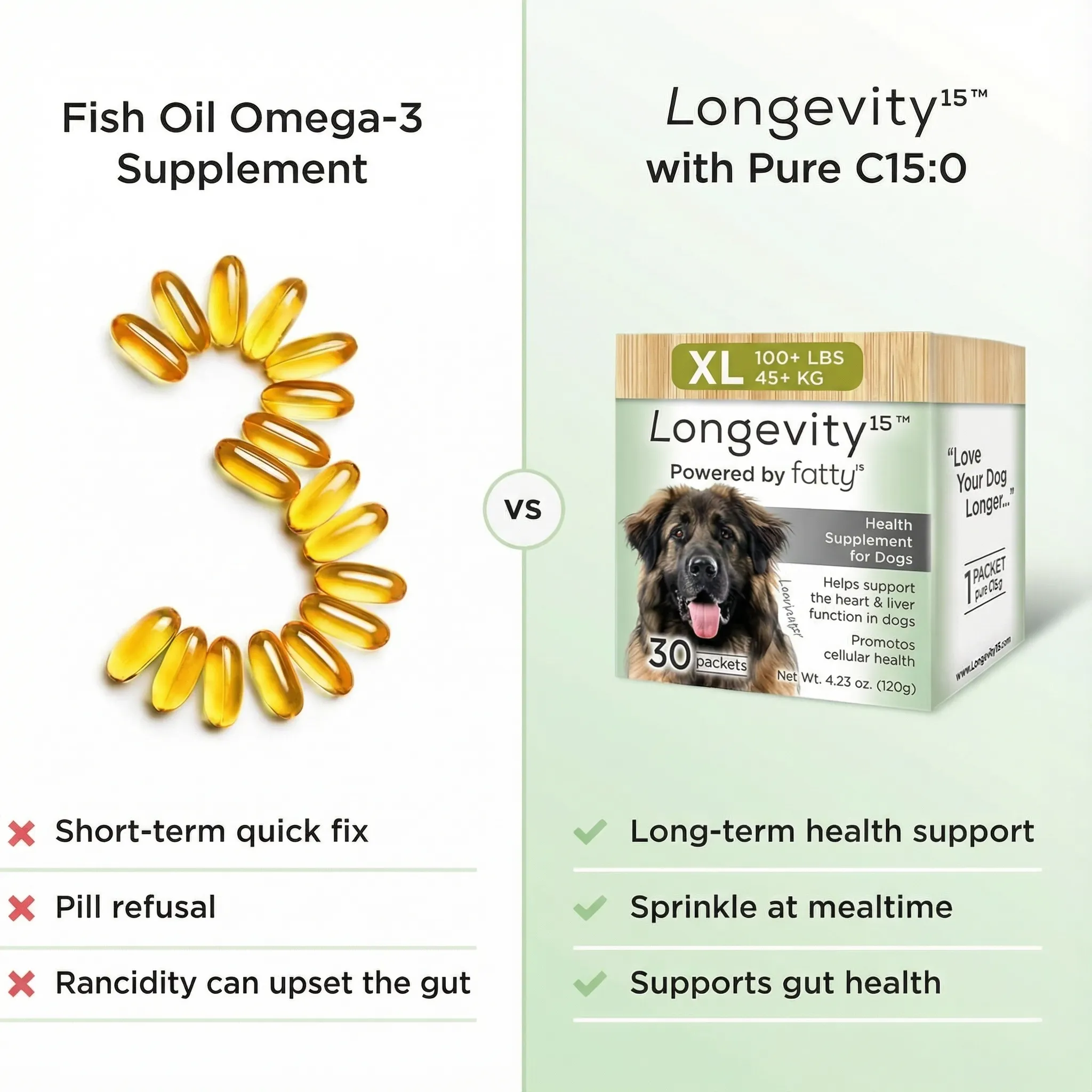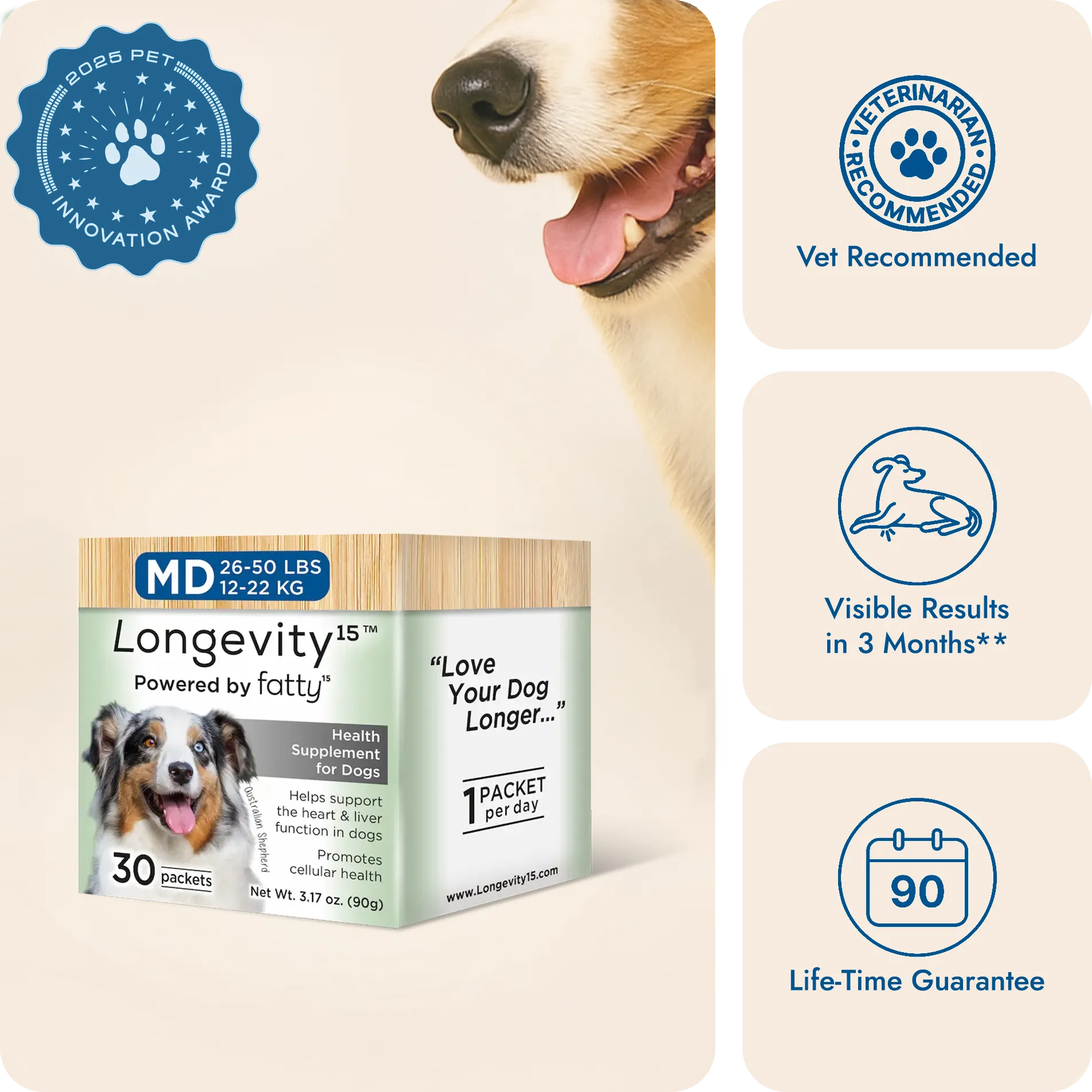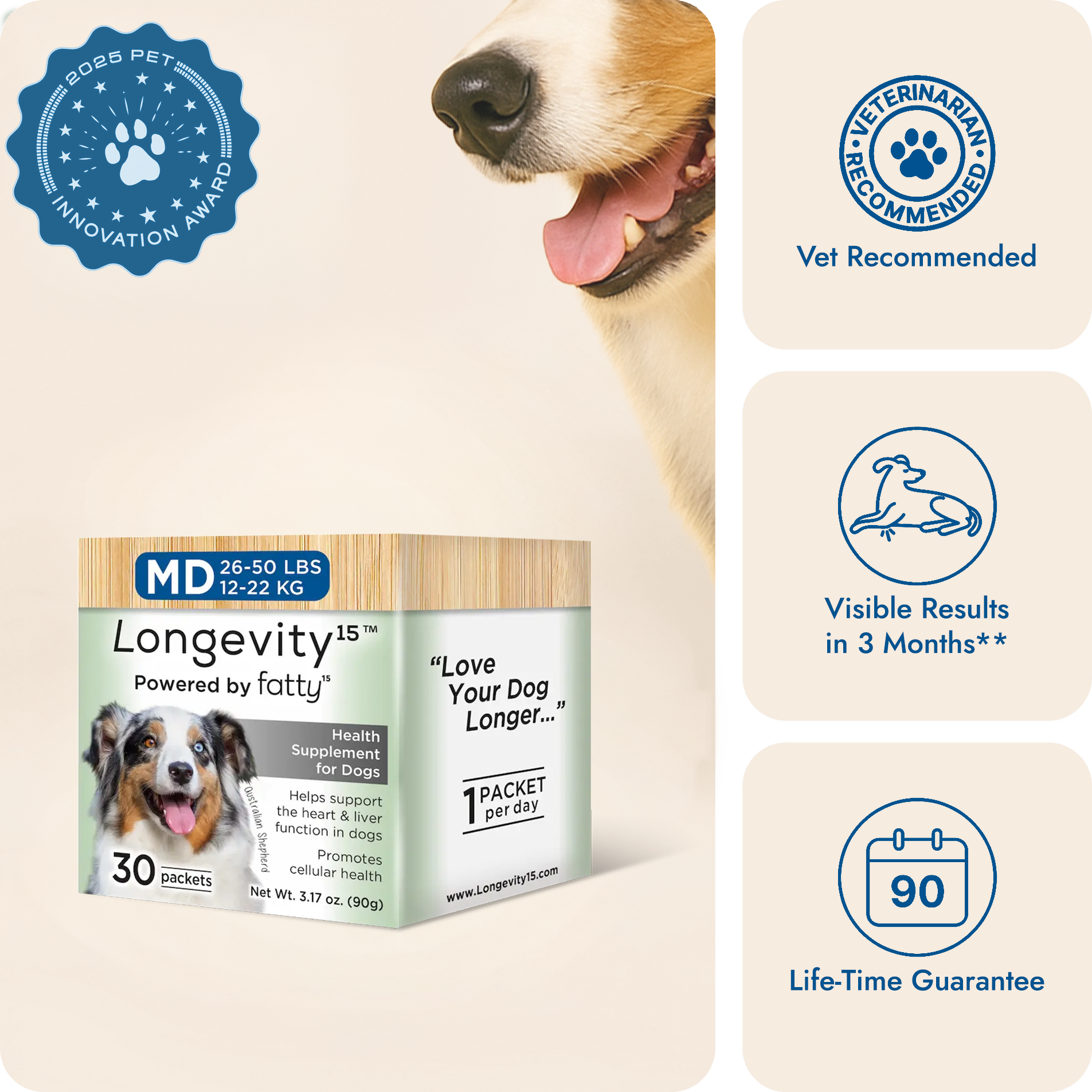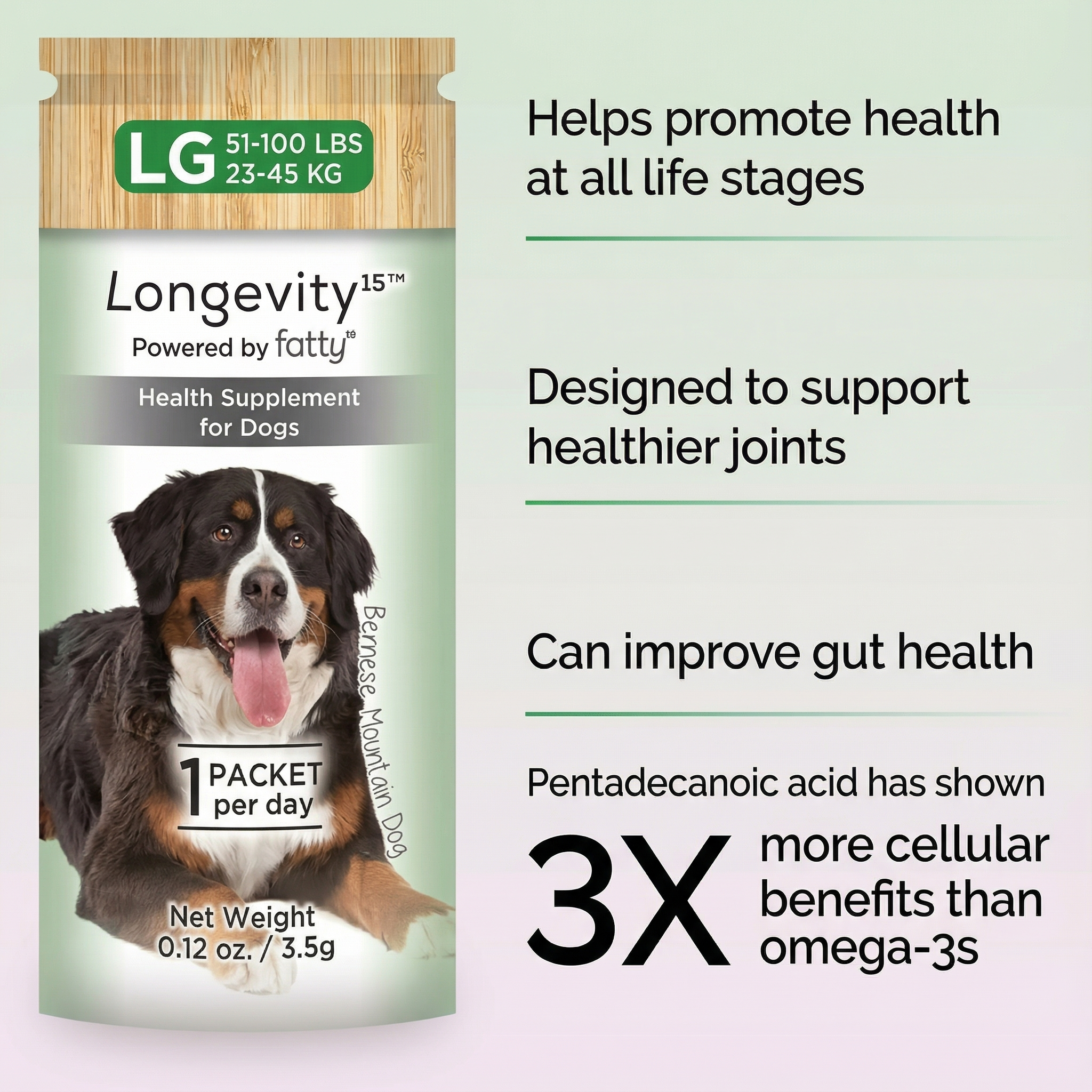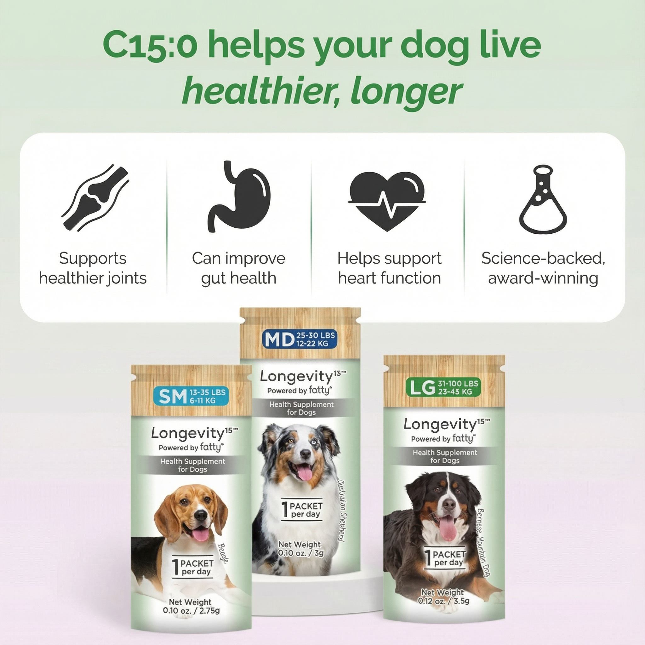 “Longevity15® is a game-changer for aging dogs. Powered by C15:0, a science-backed fatty acid shown to strengthen cells, this formula supports immune resilience, balanced metabolism, and healthy inflammatory response. Backed by real research, it’s a smart daily tool for helping dogs feel better, move easier, and age more gracefully.”